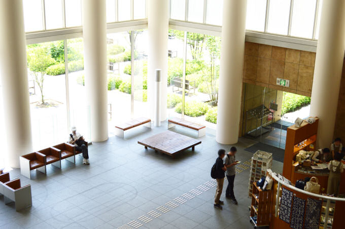 館内ロビーは、ガラス張りで外の光がたくさん入る室内に、公園の木漏れ日をながめながら落ち着いて過ごせる空間です。ロビーや通路、外にもイスがたくさんあって待ち合わせにも便利。